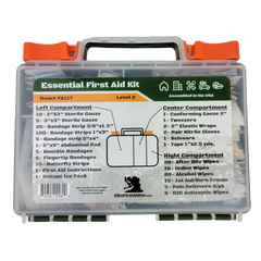 Description Elite First Aid Essential First Aid Kit ā Level 2 The Essential First Aid Kit is a General Purpose First Aid Kits that is in a rugged green, clear...
