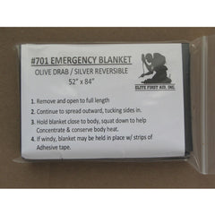 Description Elite First Aid Emergency Blanket (Olive Drab/Silver Reversible) A compact, lightweight blanket made from aluminized, non-stretch polyester. Stays flexible in freezing temperatures. Reflects body heat back to the body....