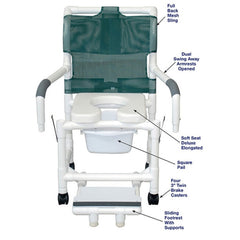 Description MJM 18" Wide Deluxe Shower Chair, 300 lb Capacity with Open Front Soft Seat, Sliding Footrest, Double Drop Arms, 3" Twin Casters and 10 Qt. Pail The MJM Deluxe...