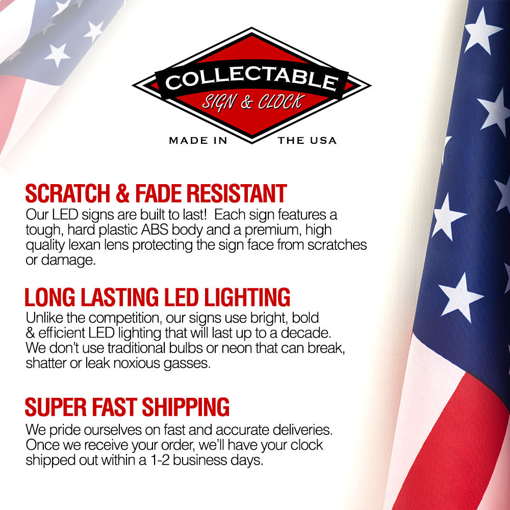 Made in the USA, all of our signs feature premium LED lights. We don’t use substandard neon or bulb lighting that will break easy, contain noxious gasses or burn out within a year. Our signs are protected by a clear lexan covering and a hard ABS plastic back that keeps the sign’s colors vibrant and beautiful for up to a decade!