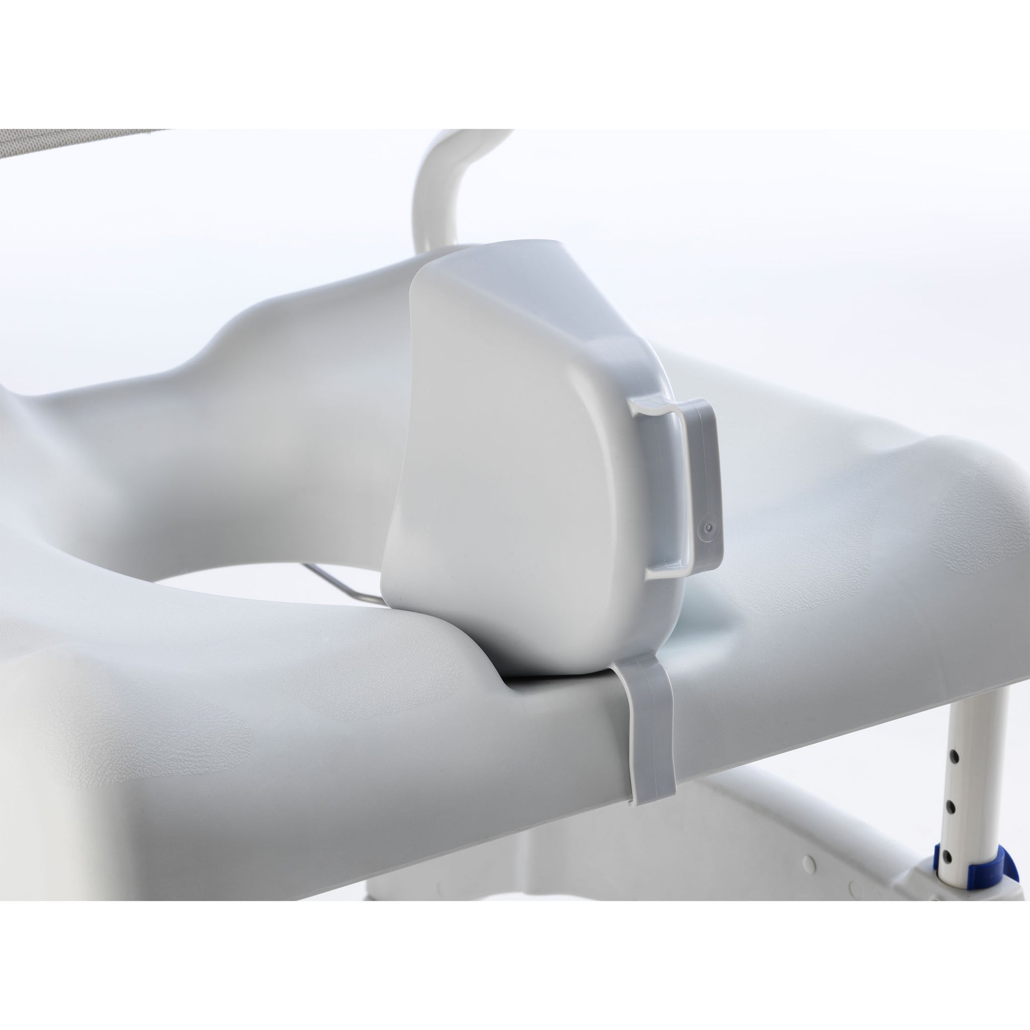 Splash guard clips onto Ergo hard seat, hygiene overlay or small hygiene soft seat overlay. Diverts or deflects urine stream into toilet or commode pan. Provides dignity for male users by visually blocking the view when sitting in a chair. Easily installed without tools.