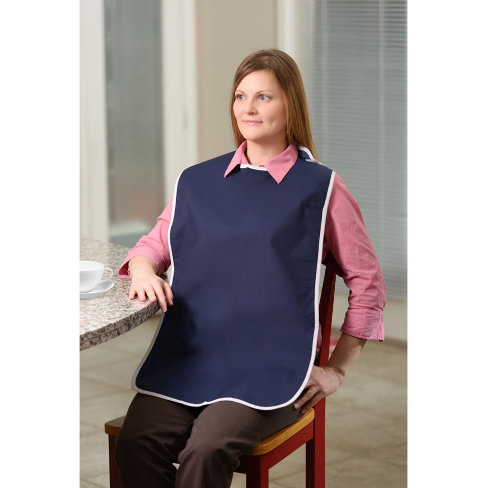 The Waterproof Shirt Saver Bib is a lightweight yet heavy-duty adult-sized bib designed to protect clothing during meals, especially for those who may not have complete motor controls. The durable, absorbent polyester-cotton blend top and fully waterproof Supplex Nylon-Backing combine to ensure that no food or drink lands on the wearer's clothing. You can consider it as an ideal bib for adults.