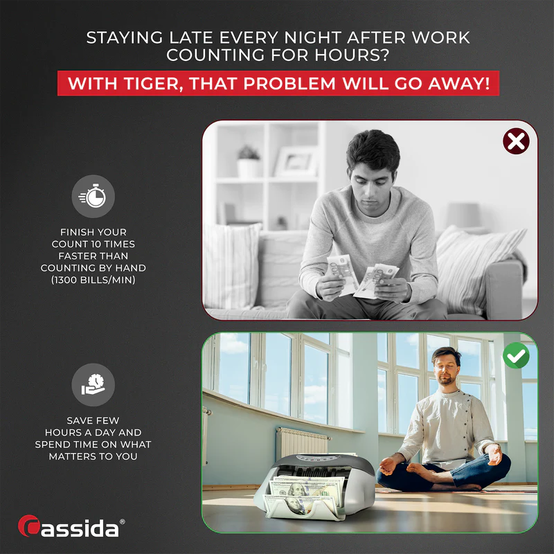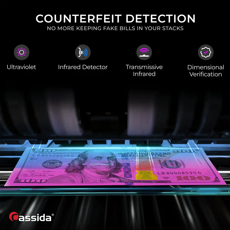 The Cassida Tiger Bill Counter is a robust and reliable back-loading machine designed for fast, accurate cash counting with advanced counterfeit detection capabilities. With a counting speed of up to 1,300 bills per minute, the Tiger handles high-volume workloads efficiently while maintaining precision. Its rugged steel construction ensures long-term durability, making it ideal for daily use in retail, banking, or office environments. Available in two models UV and UV/MG/IR it offers flexible counterfeit protection, with the UV/MG/IR model providing enhanced security through magnetic and infrared detection. Easy-access cleaning features and anti-jam technology make operation simple and maintenance hassle-free.