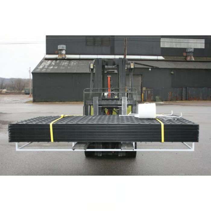 The AlturnaMAT MatPak includes twelve 4' x 8' heavy-duty mats, a metal storage rack, 20 Turn-A-Link connectors, and two ratchet straps. Each mat is made from 100% recycled HDPE, supports up to 120 tons, and features diamond cleat tread on both sides for superior traction. Ideal for creating temporary roadways or work platforms on soft or uneven terrain, this kit provides a complete, durable solution for ground protection.