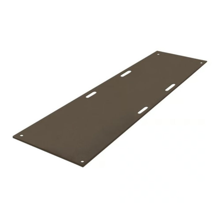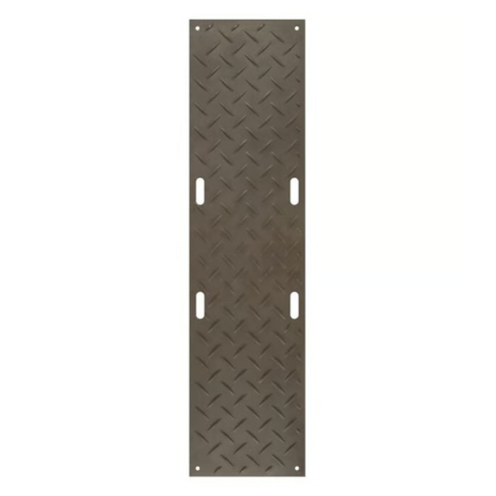 A heavy-duty ground protection mat made from 100% recycled HDPE, featuring one smooth side for sensitive surfaces, diamond tread for traction, and built-in hand holes for easy handling. Supports up to 120 tons and flexes to follow uneven terrain. Ideal for construction, landscaping, and event flooring.