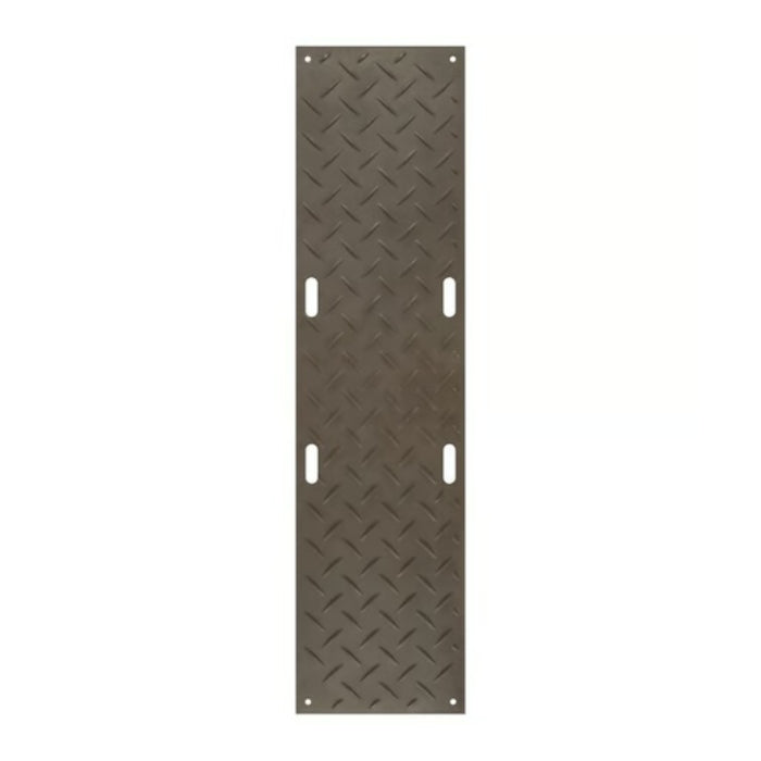 A heavy-duty ground protection mat made from 100% recycled HDPE, featuring diamond cleat tread on both sides for superior traction and built-in hand holes for easy handling. Supports up to 120 tons and flexes to follow uneven terrain. Ideal for construction, landscaping, and event flooring.