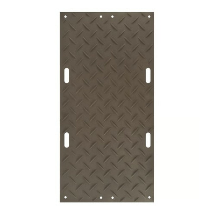 A durable ground protection mat made from 100% recycled HDPE, featuring one smooth side for sensitive surfaces and diamond tread for traction. Supports up to 120 tons and flexes to follow uneven terrain. Ideal for construction, landscaping, and event flooring.