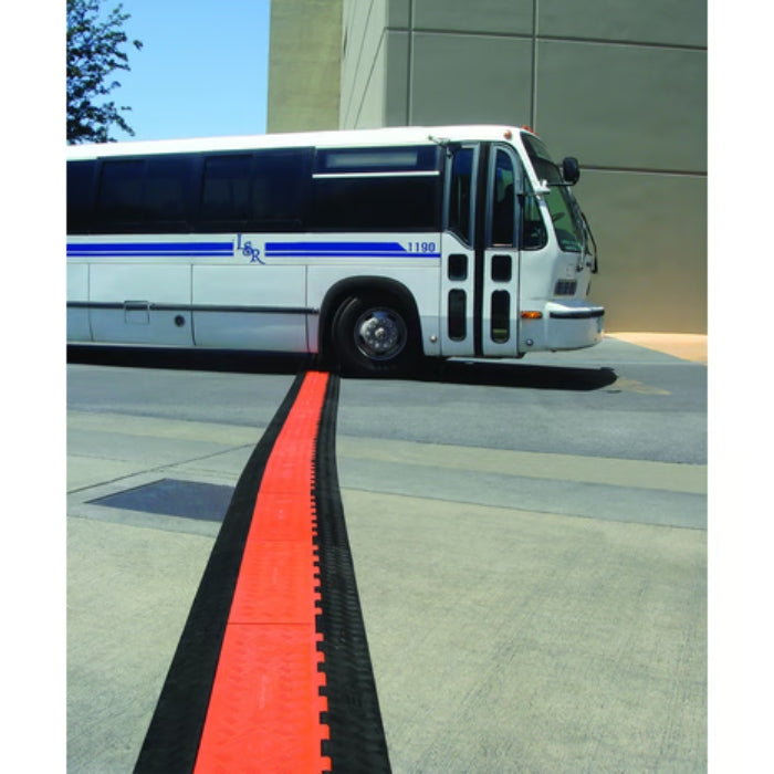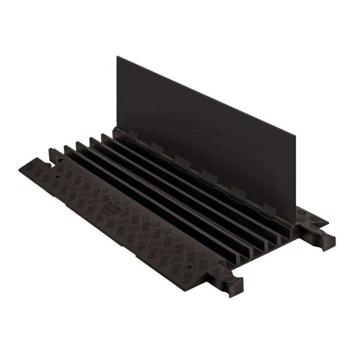The Guard DogĀ® 5-Channel Cable Protector keeps cables and hoses safe from damage and prevents tripping hazards in high-traffic areas. Built from durable, all-weather polyurethane, it features a hinged lid for easy cable placement and Dog BoneĀ® connectors for unlimited length extension. Its patented 5-bar tread surface ensures maximum traction for vehicles and pedestrians, making it ideal for events, construction sites, and industrial applications.