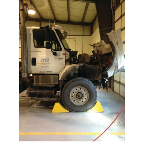 The AT3514-AC-Y All-Terrain Heavy-Duty Wheel Chock is engineered for maximum safety and durability in extreme environments. Made in the USA from high-density polyethylene (HDPE), this chock is lightweight yet incredibly strong, rated for vehicles with a gross operating weight up to 150,000 lbs (75 tons). It features a cored bottom design for reduced weight without compromising strength and a replaceable aluminum cleat for superior traction on rugged surfaces.
