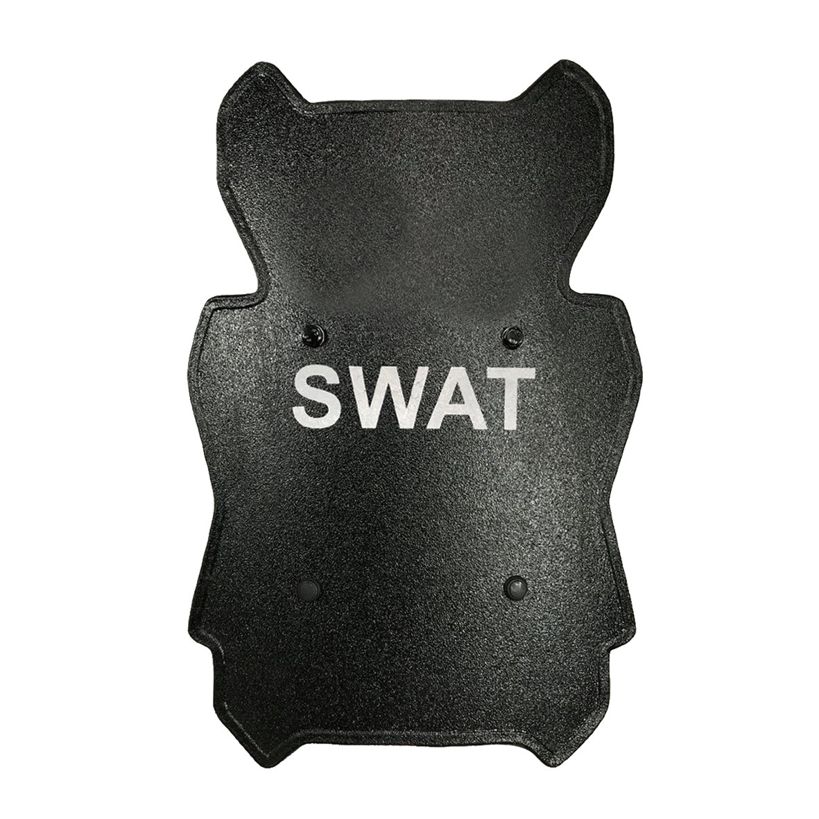 The SWAT Ballistic Shield is a lightweight, one-hand operational shield designed for close-quarter and tactical operations. Tested to Level III-A, it resists threats up to .44 Magnum, 9mm, and .357 SIG. Featuring a horizontal handle, arm/body strap, and upper firearm rests, this shield offers superior maneuverability for SWAT teams and vehicle operations. Compatible with FoxFury® tactical lights and customizable with inscriptions.