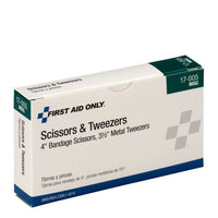 Scissors and metal forceps pack. The pack contains one pair of 4" bandage scissors with a red handle and one 3.5" metal forceps. The compact size or both items allows them to be stored and used on the go. The scissor and forcep combination pack is ideal for a first aid kit or as a stand alone supply.