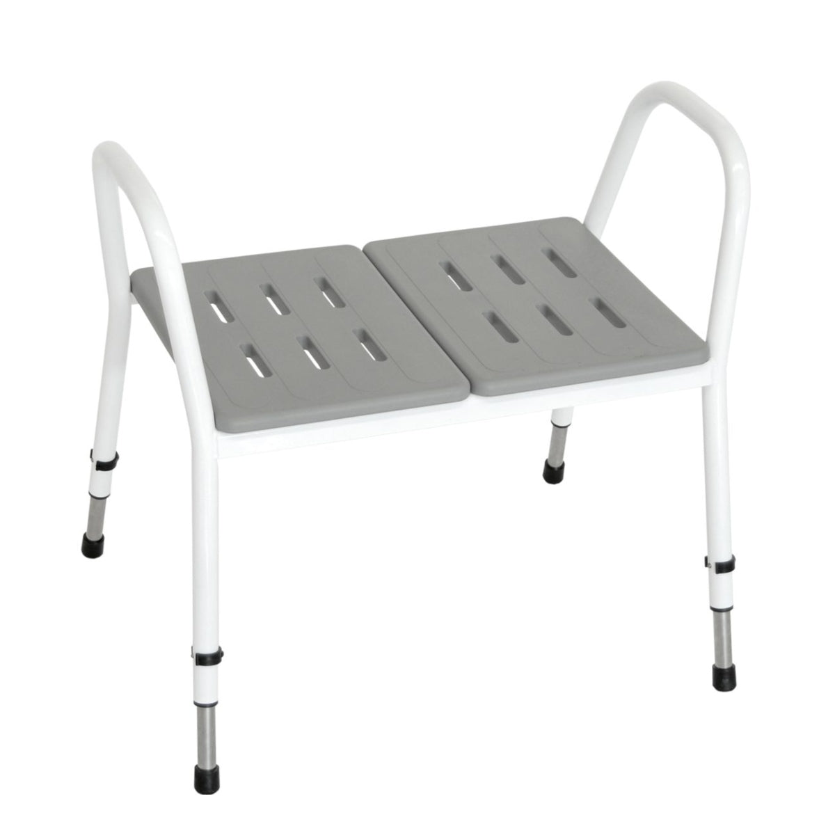 A sturdy, height-adjustable shower bench designed for larger or heavier users who need extra support and comfort while bathing. It features a soft, hygienic seat, strong arm supports, and a durable stainless steel frame for safe use in wet environments.