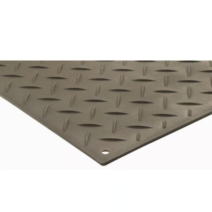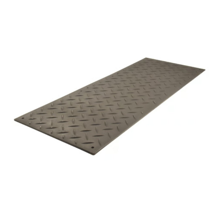 A heavy-duty ground protection mat made from 100% recycled HDPE, featuring diamond cleat tread on both sides for superior traction. Supports up to 120 tons and flexes to follow uneven terrain. Optional hand holes make handling easier. Perfect for construction, landscaping, and event flooring.
