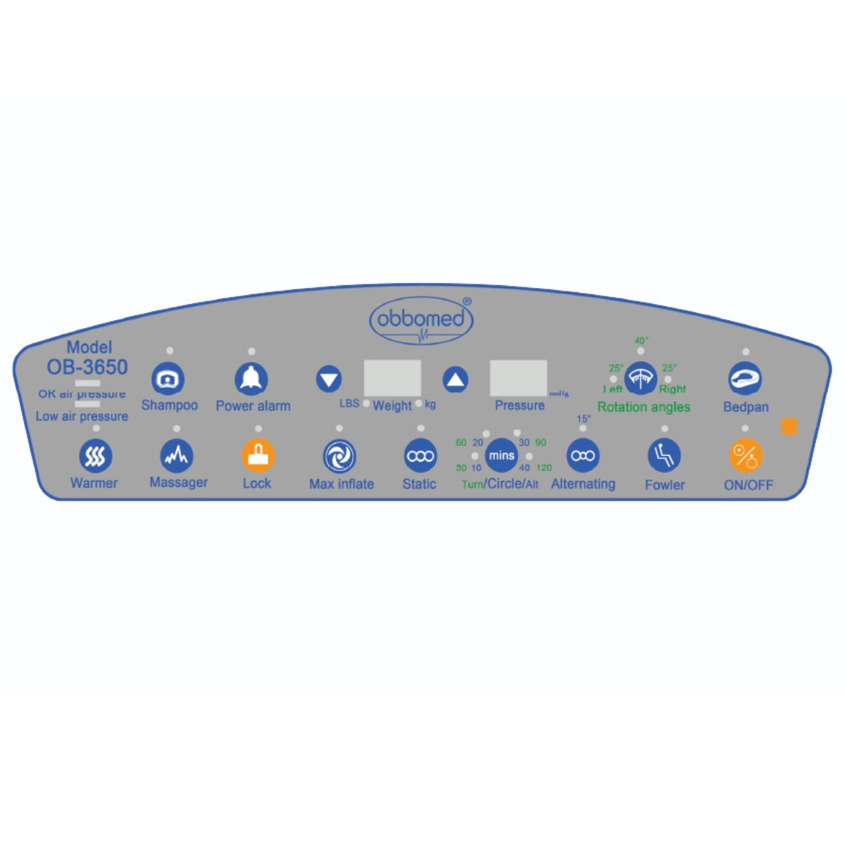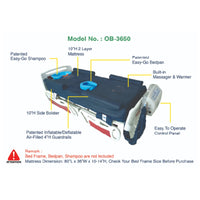 The ObboMed OB-3650 Ultra Air Mattress is a premium care solution designed for advanced ulcer prevention and patient comfort. It features dynamic low air loss technology with a powerful 23 LPM airflow, alternating pressure therapy, and adjustable self-lateral rotation angles of 15°, 25°, and 40° to promote circulation and reduce skin breakdown. The patented "Easy Go" bedpan and shampoo systems offer convenient hygiene care, while the inflatable "Air-Filled" guardrail ensures added safety.