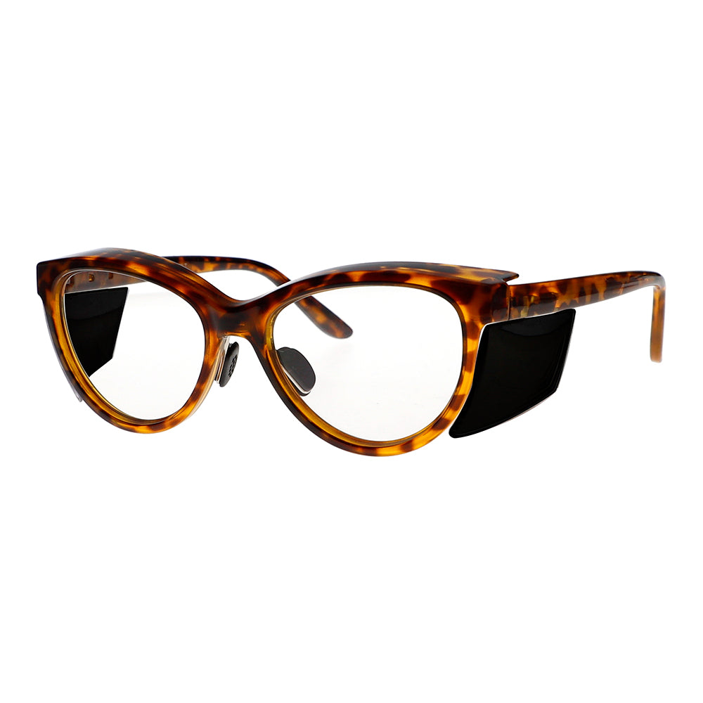 The Radiation Safety Glasses T9730 is a stylish, cat eye lead glasses, with prescription available. These lead radiation glasses have integrated side shields for additional protection. Plus, the T9730 also features rubberized and adjustable nose pads for extra comfort. In addition, the radiation reducing lenses are made from distortion-free SF-6 Schott glass lenses and offer a protection level of .75mm Pb lead equivalency. The T9730 radiation lead glasses are available in black with white, black with teal, and tortoise.