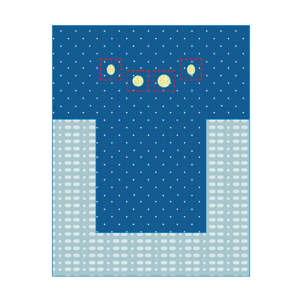 Specialist drapes for permanent pacemaker, ICD, CRT-D, and lead-extraction procedures. Both sizes feature two full-length transparent arm/shoulder panels so the patient can see their hands and the team can constantly monitor both arms and neck without breaking sterility. Multiple 10 cm round (or 6Ć9 cm oval) iodine-impregnated incise zones can be cut to the exact size and position needed for jugular, subclavian, axillary or cephalic access. Heavy absorbent reinforcement in the chest area handles longer cases with confidence. Choose the standard 200 Ć 400 cm or the extra-large 320 Ć 375 cm version for taller patients or additional equipment coverage. Available individually sterile or economical non-sterile bulk.