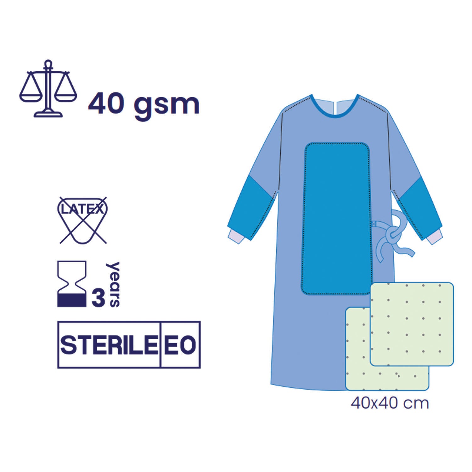 - Sterile packaging: Individual pouch (1 gown + 0/1/2 towels depending on model)
