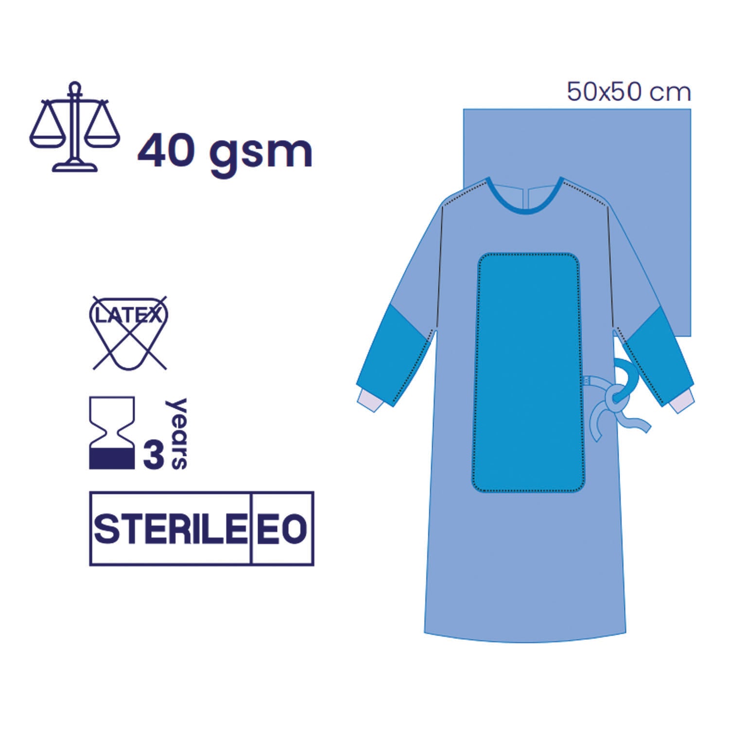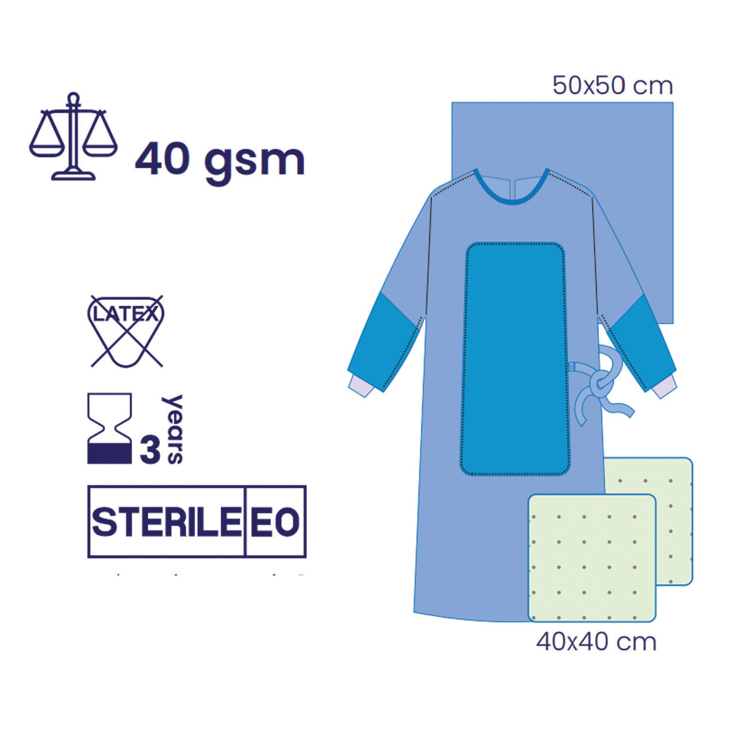 - Sterile packaging: Individually wrapped (1 gown + 0/1/2 towels)