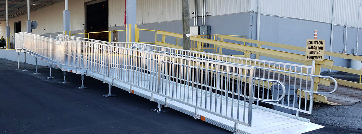 Use the 1:12 ADA ratio: Measure the rise (vertical height), then multiply by 12 for the run (horizontal length). For a 24-inch rise, you'll need a 24-foot ramp. Factor in landings for longer runs. Our modular Rampit and National Ramp systems make custom sizing easy—contact us for a free quote.